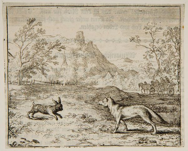 Curator: There's a playful, almost mischievous energy to this little scene. The fox seems to be mid-leap, about to pounce! Editor: Indeed. This is a design by Allart van Everdingen entitled "Reynard leaps in air and greets badger at riverbank." It's quite small, just a few inches in either direction. Van Everdingen was a 17th-century Dutch Golden Age painter and printmaker. Curator: I love how the landscape is so detailed despite the tiny scale. It's like looking into a miniature world. Editor: The choice of subject is also important. Reynard, of course, from the medieval fables, a figure of cunning and trickery. Van Everdingen’s decision to portray him gives us an insight into the socio-political role of animals. Curator: And yet, he looks so joyous! It makes you wonder what kind of trickery he is up to. Editor: Perhaps, the joy is the trick. Anyway, a really charming artwork. Curator: I agree; it ignites the imagination with its cleverness.