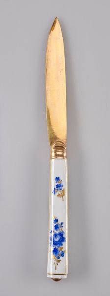 This knife was made from porcelain at the Meissen Porcelain Factory in Germany. Meissen was the first European factory to successfully produce porcelain, initiating a new fashion for these wares. Prior to this, porcelain was produced exclusively in China and Japan, and was highly prized in Europe, which leads us to ask, what is the public role of luxury? Here we see the handle adorned with delicate blue floral designs. These designs reference the earlier Chinese porcelain production while initiating a recognizably European style. The gilded blade suggests the extravagant wealth of the upper classes. The knife becomes a signifier of social status. To understand the art of this period, we need to consult widely, looking at historical texts about porcelain production, the fashion for chinoiserie, and the economics of trade between Europe and China. In this way, we can understand the values and the cultural context of 18th century Europe.