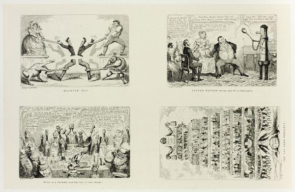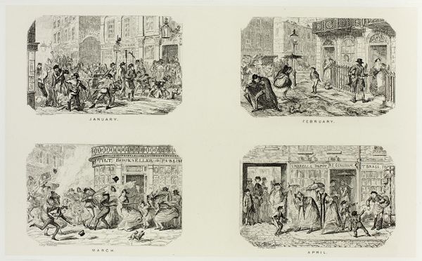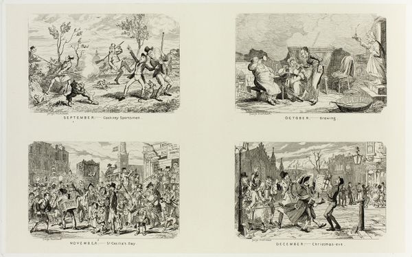 Curator: Welcome. We’re looking at “May – ‘Old May Day’,” a steel etching by George Cruikshank, made sometime between 1836 and 1880. Editor: What a lively scene! I see a swirling, joyous dance around a maypole. The composition, though densely packed with figures, creates a wonderful sense of kinetic energy. Curator: Indeed. Cruikshank was well-known for his illustrations and caricatures, and this print exemplifies his style. As an etching, it would have allowed for relatively quick reproduction and dissemination. Consider how that accessibility shapes the image’s reception, reaching a broad audience and perhaps informing public sentiment regarding traditions and holidays. Editor: I'm drawn to the maypole itself – a phallic symbol, clearly – representing fertility and the renewal of life after winter. It's surrounded by dancers, most likely young villagers, celebrating the arrival of spring. Note the careful detail paid to the figures, though they're rendered small, each carries its own expression. Do you think the scene is more idealized or satirical? Curator: Probably both! Romanticism had a heavy influence during the time, however this piece could be interpreted either way. Let’s not overlook the surrounding context of agricultural labor. The May Day holiday historically served as a moment of communal gathering, celebration, and a temporary respite from the agricultural cycle. It was also a means for socializing, exchanging information, and solidifying community bonds, perhaps also about to evolve as industrial practices gained strength. Editor: I see the echoes of pagan rituals in the imagery; it's fascinating to witness how these ancient symbols adapt and persist through centuries of changing social landscapes. The architecture visible in the background—is that meant to signal a specific locality? Curator: Potentially, yes. It is also quite standard imagery found in much artwork during that time. Editor: Fascinating how the celebration seems both timeless and anchored to a very specific moment. It’s given me much to consider in the ongoing evolution of visual language. Curator: For me it serves as a reminder of the importance of considering social and economic conditions in artwork and understanding the relationship between materials, means of production, and consumption.