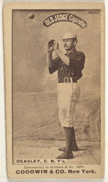 Editor: This is a collotype print from 1887, a baseball card titled "Michael Cornelius Dorgan, Right Field, New York," made by Goodwin & Company. The sepia tones and the composition—the player posed mid-throw—give it such a vintage, nostalgic feel. What stands out to you when you look at this piece? Curator: The enduring visual appeal arises from the masterful use of line and form. Note how the vertical stripes of Dorgan's shirt interact with the implied horizontal plane of the baseball field, creating a dynamic tension. How does this contrast contribute to the image's overall structure? Editor: I see what you mean! The lines almost pull you in different directions, but Dorgan's stance plants him firmly in place. Curator: Precisely. Consider also the photographic process itself. The collotype allows for a remarkable tonal range, capturing the nuances of light and shadow. Do you notice the subtle gradations in the background? Editor: Yes, the way it fades out almost suggests movement, even though it’s a static image. It gives the impression of a vast playing field. The soft focus contributes to that too. Curator: Indeed. The lack of sharp detail further emphasizes the geometric clarity of the composition and focuses our gaze on the subject and his action. It is a beautiful example of form dictating function, even within a commercial object. Editor: This has definitely made me look beyond the subject matter and appreciate the formal qualities that contribute to its appeal. Curator: Likewise. Thinking about how technique and visual structure can elevate the simplest subject, and that's invaluable.