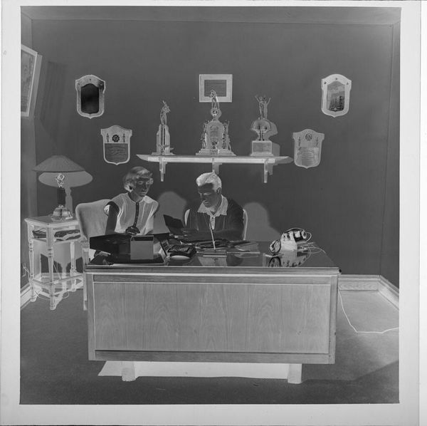 Curator: Look at this charming gelatin silver print by Jack Gould, currently titled "Untitled," but showing a photographer capturing a portrait of two young boys. It's intimate, almost like a peek behind the scenes. Editor: It does have a sense of immediacy. All of this equipment, though. The draped table, the flash—photographic labor made visible. It's not just about the cute kids, but the whole apparatus of image-making. Curator: Absolutely. And you can almost feel the photographer’s intent, wanting to capture a specific moment, a memory in the making. The light and shadow play so well. Editor: I see it as a document of a particular kind of mid-century labor, a studio setup brought into the domestic sphere. All that wiring, the posed backdrop—it speaks to the commodification of portraiture. Curator: Maybe, but I’m drawn to the human element—the connection between the photographer and his subjects, a fleeting moment turned into something lasting. Editor: Fair enough. I still think there’s something compelling about the materiality of the photograph itself, how it reveals its own construction. Curator: A point well-taken! Let’s leave it at that—a sweet image, and a window onto the mechanics of its own creation.