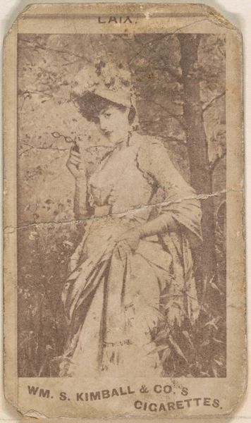 Curator: This albumen print, part of the Actors and Actresses series, was issued by Duke Sons & Co. to promote Duke Cigarettes sometime between 1890 and 1895. The sitter is Lilie Sinclair, and it’s currently held at the Metropolitan Museum of Art. Editor: It has an immediate nostalgic aura. The sepia tone lends such a lovely, aged quality, as if unearthed from a cherished family album. It captures a moment of quiet grace. Curator: Absolutely. These were produced at a time when the burgeoning advertising industry realized the power of celebrity endorsements. Cigarette companies often used these cards featuring actresses and other public figures to increase their brand appeal. Sinclair here projects a delicate beauty that consumers would then associate with the Duke brand. Editor: Her pose seems staged yet relaxed. Note the casual lean against the chair—suggestive of fashionable portraiture. Her dress and, particularly, that flower-laden hat carry heavy symbolism related to beauty and success on stage, and likely would have served to inspire aspirations among female consumers. Curator: Indeed, the hat itself would signify high fashion and access to elite social circles, so strategically aligning tobacco with a sophisticated lifestyle. But there's more to this than meets the eye: Tobacco cards also circulated in the Victorian era during an increasing interest in theater, vaudeville, and other live arts that offered an aspirational cultural currency, even outside wealthy circles. The mass appeal would work as advertisement as well. Editor: This alludes to how imagery functions to shape cultural tastes and social desires. Duke Cigarettes effectively capitalized on these dynamics, embedding their product within the pursuit of glamour and success, associating smoking with theatrical celebrity and achievement. The image almost acts as a talisman. Curator: Very astute observation. The power of associating consumerism and fame becomes vividly clear when one analyzes the culture around these objects. Editor: It really illustrates the potency of symbols and how they can intertwine with marketing and aspiration. The quiet, dreamy tone seems at odds with the intent of a commodity ad, but creates a really interesting tension that shows a slice of society and its values at the time.