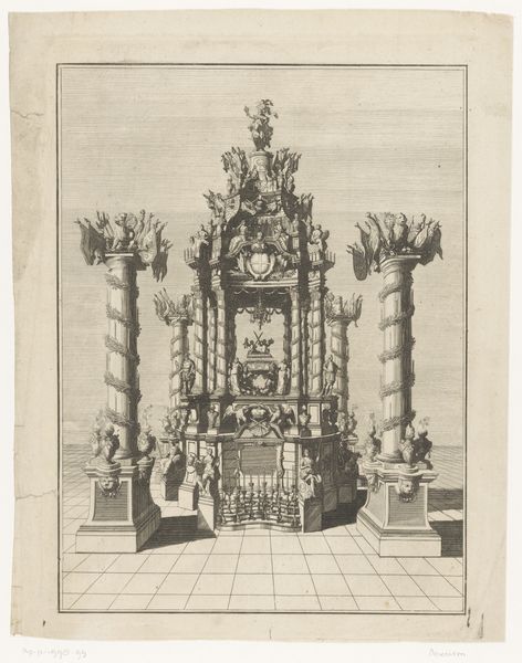 Pierre Lamarque made this print, "Praalgraf van Eugenius van Savoye", to commemorate Prince Eugene of Savoy, an Austrian general who lived from 1663 to 1736. The print depicts a grand, multi-tiered monument located within a church, possibly Saint Stephen's Cathedral in Vienna. The architecture is adorned with sculptures and heraldic symbols. The two monumental pillars flanking the structure add to its grandeur. The artwork is not just a memorial to a military figure, but a symbol of power, class, and cultural identity in 18th-century Europe. Lamarque has created a piece that reflects the period's values of aristocracy and military might. It serves to perpetuate the legacy of Prince Eugene and to embed him within a narrative of European aristocratic accomplishment. The work reflects how societal elites use art to preserve and promote their image. It encourages us to consider who is being memorialized, and what values are celebrated through these acts of remembrance.