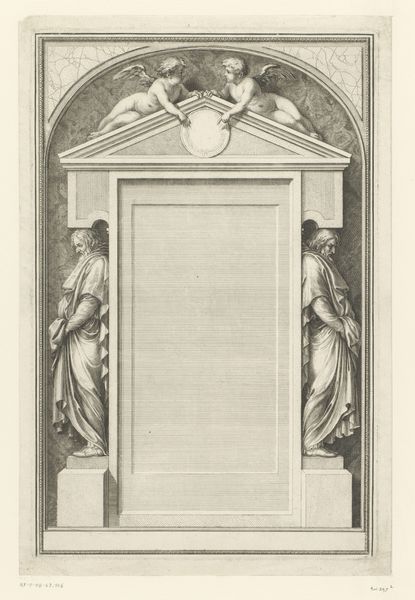 Editor: Here we have "A standing man in a niche looking toward the left," an engraving from 1756 by Bartolomeo Crivellari. The figure looks austere, almost severe. How do you read this figure in this architectural setting? Curator: The piece makes me think about how power and authority were constructed and projected in the 18th century. Think about the era—the Enlightenment, the rise of academies. This engraving embodies those aspirations for order and reason. Editor: So, the classical framework is more than just aesthetic? Curator: Absolutely. The niche is deliberately referencing antiquity, connecting this man, whoever he may be, to that lineage of thinkers and leaders. It asks: who is included in that legacy, and who is excluded? Consider who has access to this kind of representation and why. It wasn't simply about artistic style. Editor: The gaze does seem important here. Curator: Indeed. Note how the man directs his gaze—away, as if contemplating something beyond our view. That purposeful avoidance engages a concept central to thinking on performativity, particularly through gender and race. Who is offered that gaze as an everyday privilege? Who can afford that expression? Who has to be seen to survive? Editor: That definitely shifts my understanding of the piece. I had initially focused on the technique and classical style. Curator: It's about connecting the dots – seeing how seemingly formal choices reflect broader power structures. These visual languages dictate societal roles and influence even today's politics. We have to constantly critique whose voices and images dominate our visual sphere and challenge those dynamics. Editor: I never considered how much art could reveal about those dynamics of society, even an engraving like this one! Curator: Art holds a mirror to the structures that create visibility and erasure. That mirror reflects inequalities, so we need to look closely.