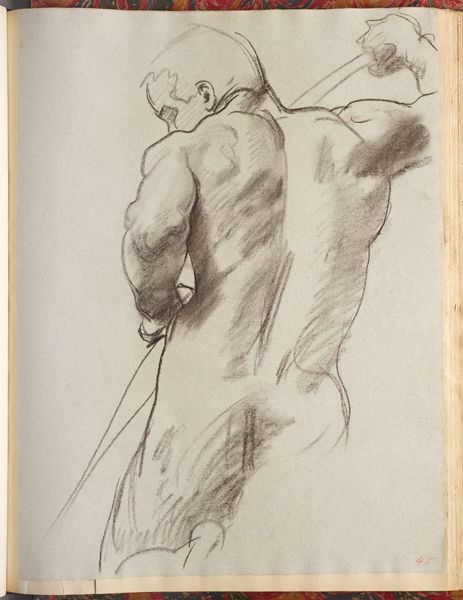 Curator: This is John Singer Sargent’s "Study for Trumpeter Heralding Victory; Two Studies of Feet, for Death and Victory," a preparatory work for a mural. Editor: There’s a raw, almost brutal energy to this sketch; the figure’s contorted pose and the sharp lines convey a sense of struggle. Curator: Considering this was a study, Sargent’s process shines through. The visible layering and reworking of lines reveal the artist grappling with form and composition. The materiality of the paper and charcoal becomes quite important here. Editor: And that trumpet seems to pierce the silence, a symbol of triumph emerging from chaos. Notice the tension in the figure, caught between effort and proclamation; the imagery feels very calculated. Curator: Absolutely, but understanding the labor involved in creating these large-scale murals, the physical demands, reshapes our perception of the heroic narrative it aims to portray. Editor: Looking at the feet, too, evokes a journey, a foundation for the victory being heralded. Sargent is definitely working with symbolic weight here. Curator: Examining Sargent’s studio practices contextualizes the grand narratives he often depicted. Editor: Ultimately, it’s a compelling exploration of triumph through potent visual metaphors.