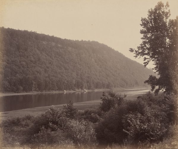 Editor: So, this is William Henry Jackson’s photograph, "Mouth of Indian Creek." It's a monochrome print, quite still and serene. What strikes you when you look at it? Curator: It feels like a glimpse into a disappearing world, doesn't it? Jackson, documenting the West, captured this creek's mouth not just as scenery, but as a point of collision between nature and industrial progress, that tiny train chugging across. Do you feel that tension, that stillness before a great change? Editor: I do! There's such a strong contrast. Curator: Exactly! And the light, almost ethereal, softens the harshness, don’t you think? What do you suppose Jackson wanted us to consider? Editor: Maybe to think about what we gain and what we lose? Curator: Precisely. It makes you wonder, doesn’t it? What will remain when the creek meets the machine?