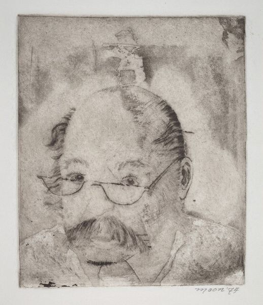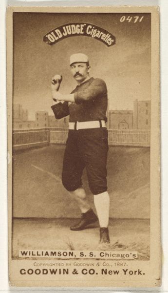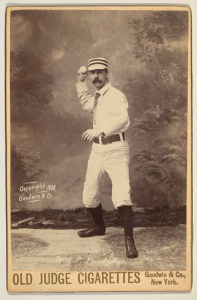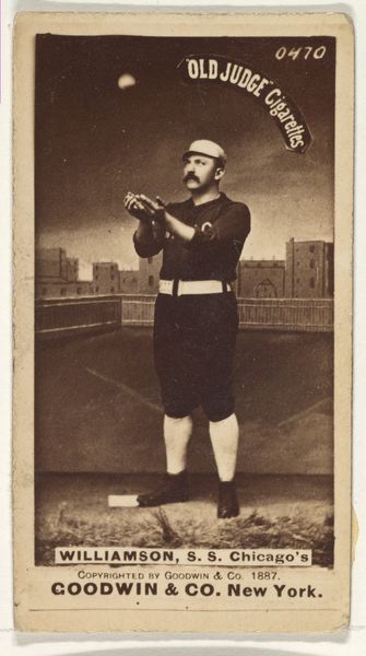 Curator: This is "Tom Barrow," a 1975 print by Mike Mandel, part of a series he made compiling portraits with baseball cards. It strikes me as quite ordinary on the surface, yet quietly subversive in its ordinariness. What’s your immediate take? Editor: Ah, it’s the nonchalant gaze skyward. Instantly, I feel I know Tom— a character out of a Kerouac novel perhaps, gazing into some endless possibility. Is it yearning or simply spaced-out enjoyment? Curator: Exactly. Mandel’s gesture draws from both street photography and conceptual art. We're dealing with standardized, mass-produced baseball card prints. It uses a cheap printing press to show everyday figures, subtly questioning the elevated status traditionally given to photographs presented in galleries. The production and display is essential. Editor: Mass production does rob us of the magic somewhat, doesn't it? Yet it also levels the playing field – we're all just Tom, looking at something just beyond our grasp. He’s like every hipster I’ve ever met, gazing poetically! Curator: Mandel isn't elevating any heroes but implicating us in systems of valuation. This democratization suggests he's as intrigued by labor and commodity as he is with ideas about how we project narratives. This one resonates for what its availability says about representation. Editor: Representation! Now you put a finer point on it. I get the sense of yearning that's universal but grounded. It's powerful, even poignant. There is, beneath the moustache and glasses, something deeply touching about this dude and how he offers the sky. Curator: Yes, even through these modes of reproduction, portraiture provides, doesn’t it, the illusion of closeness? That even in a culture where mass production and quick printing determine visual reality, individuals—whether baseball players or the bespectacled Tom—find space to dream. Editor: Dream is right. He’s just looking up... what is there even TO see, except more possibility. It gets to you. Alright. Curator: And with a turn of the head, the dialogue begins again, which is all anyone could hope.