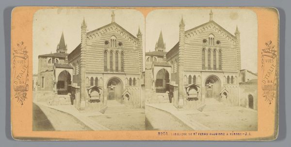 Curator: What immediately strikes me is the stillness, almost a quiet dignity in this image of Sint-Kunibertkerk, in Cologne. It's by Theodor Creifelds, a gelatin silver print dating roughly between 1855 and 1875. Editor: Absolutely! It has this dreamlike quality, right? A little faded, almost sepia-toned, which lends it a vintage romance. Like something lifted from a half-remembered story. Curator: The photographic process itself is central here. Gelatin silver prints gained popularity in the mid-19th century, a time of immense social upheaval. The emerging technology allowed for greater reproducibility, shaping the collective visual memory and disseminating ideologies of urban development and national pride, often at the expense of marginalized communities. Editor: Oh, I get that on a gut level, I do! The symmetry pulls me in; I love how the perspective makes the church both massive and somewhat... unattainable. A place of solemn reflection perhaps, or maybe a representation of societal ideals we keep striving towards? Curator: Considering the era, we can analyze this as a conscious act of preserving architectural heritage, a prevalent trend among the European upper classes who aimed at linking national identity to distinct styles. Photography offered them an easy way to document, classify and make assertions of what constituted “culture.” Editor: Mmm. It makes me wonder who’s in the foreground, in that tiny silhouette… Someone paused, contemplating eternity, maybe? The little fence—or barricade?— almost seems to dare the person to enter that sanctified space, like crossing into a secret garden of history. Curator: It reminds us that even seemingly objective mediums like photography are enmeshed in intricate social and political power relations. Understanding photography's role during periods of imperialism helps decipher how specific narratives were promoted and dissenting voices silenced. Editor: In essence it invites me to see how far we’ve travelled… What foundations remain of those initial dreams, aspirations cast in stone… Makes you think. Curator: Precisely, it encourages a continuous process of questioning and uncovering multiple narratives hidden beneath established images. Editor: Well, for me it whispers of ancient stones and even more ancient longings.