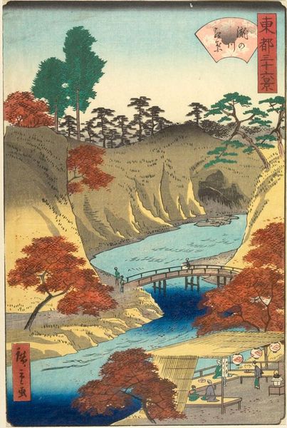 Curator: Hiroshige’s woodblock print, "Inside Akiba Shrine, Ukeji," from his *One Hundred Famous Views of Edo* series, certainly evokes a sense of tranquility. The vivid blue is the first thing that strikes me. Editor: That overwhelming blue seems to flatten the scene, doesn't it? It nearly drowns out the figures and the hints of red foliage. Is it really a scene of peace, or one of suppression? Curator: The blue, while dominant, also suggests a spiritual cleansing, linking water with purification rituals common at shrines. The shrine itself is present, hinting at the sacredness of the location. Editor: I see how the shrine serves as an entry point, but the skewed perspective unsettles me. Are we invited in, or kept at a distance? It feels like a constructed, idealized space, not a lived one. Curator: But perhaps that's the intention – to present an idealized vision of Edo, highlighting its spiritual heart through symbolic representation rather than literal depiction. Editor: Maybe. It still feels like a carefully curated version of reality, obscuring the socio-political complexities of the time. Thanks for sharing your insights, though. Curator: And thank you. It’s always good to consider how these images spoke then and what they can tell us now.