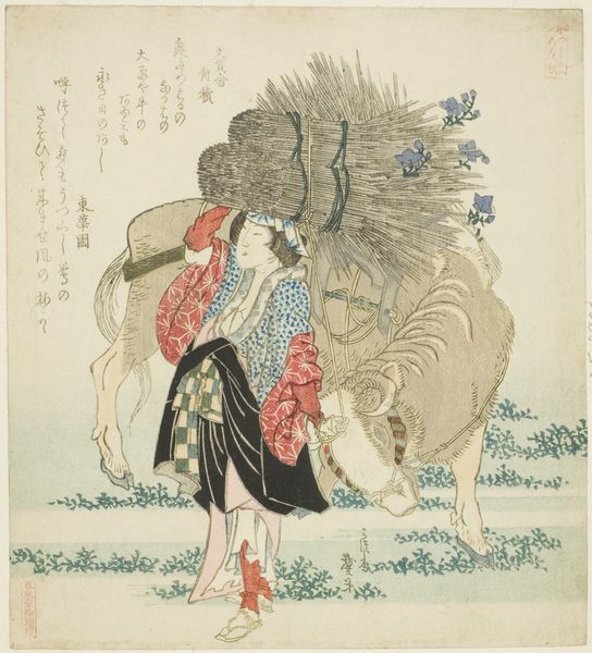 Editor: This is Yashima Gakutei's woodblock print, "Chinese Warrior Grappling with a Horse," part of the Twelve Zodiac Animals series. It’s striking how the warrior and horse are locked in this intense struggle. What does this scene tell us about its cultural context? Curator: This print reflects the late Edo period’s fascination with Chinese mythology and zodiac symbolism. Consider how prints like these, circulating amongst the merchant class, served as accessible forms of cultural engagement. The warrior-horse conflict perhaps symbolized the anxieties or aspirations of that era. How might the public have interpreted such a scene? Editor: I hadn't thought about its circulation amongst the merchant class. Knowing that definitely shapes my understanding. Thanks! Curator: Indeed. Art doesn't exist in a vacuum; understanding its distribution and audience is key to unlocking its meaning.
