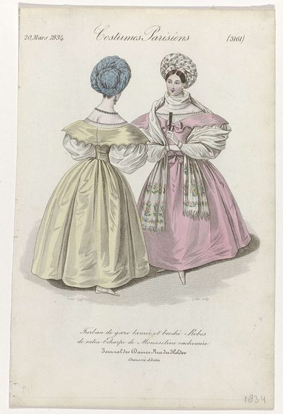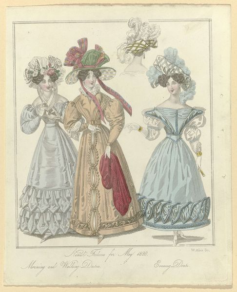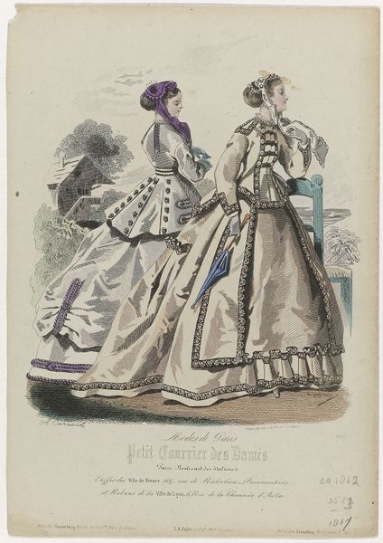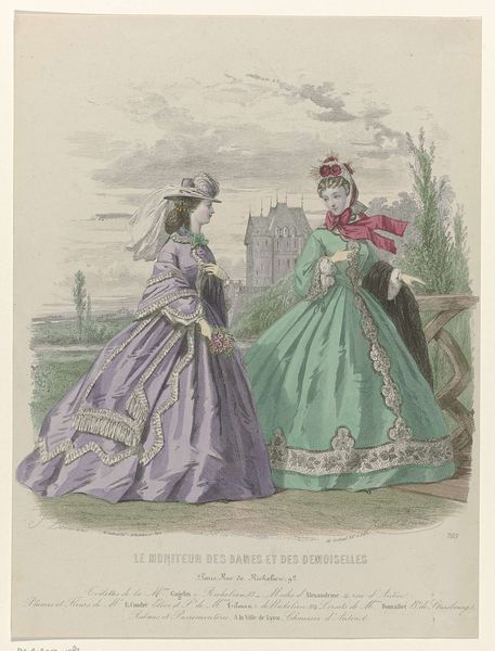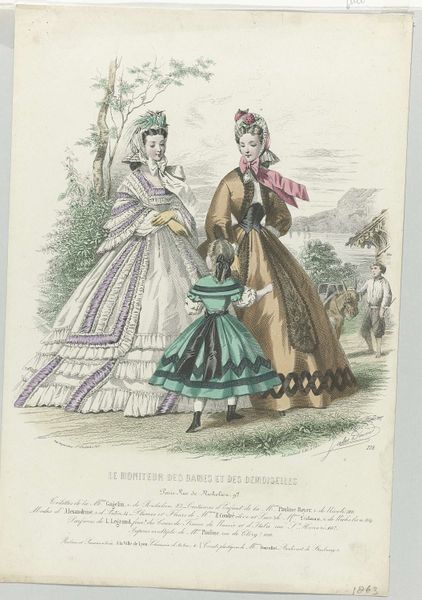 Curator: Ah, yes, here we have an intriguing print entitled "La Saison, 1872, No. 9, 5e année: Toilettes et nouveautés." What's your first impression? Editor: Exuberant! It's a confection of frills and curves. The high-keyed color relationships almost vibrate off the page, creating a dynamic field. I am especially intrigued by the subtle gradations of color, seemingly a complex array of tones and tints! Curator: Indeed. As the title indicates, this piece comes from a periodical focusing on fashion, illustrating contemporary garments. One can sense the emergence of the department store and the rise of consumer culture in Paris. The image becomes a vital instrument, documenting the newest and greatest trends. Editor: The semiotics are fascinating, particularly how each element of dress conveys social status. Consider the layering effect of the fabric—it is more than just adornment. Curator: It mirrors the era's elaborate social protocols. The print becomes an aspirational vision, promising the modern bourgeois woman entree into privileged society. One can examine the parasols they carry, protecting their fairer complexions! Editor: True. They are almost like an exoskeleton. Speaking structurally, it's striking how each dress functions almost as its own autonomous form, especially given the layering effect. Consider how these choices also might reinforce an individualistic philosophy... Curator: Fascinating! One could look also at the background landscape, with its ambiguous depiction of greenery, indicating how fashion transcended private spaces to infiltrate public ones, like the Bois de Boulogne, for example, which in effect, staged the drama of social performance. It certainly is interesting. Editor: Absolutely. Analyzing such artifacts also prompts questions of gender and visibility—examining whose presence in public life mattered. These visuals function within wider cultural constructs and systems. Curator: Indeed, it underscores the socio-economic contexts of that era and emphasizes visual economies. This print, though beautiful, underscores more. Editor: This close consideration reveals a wealth of aesthetic and cultural insights! Curator: Precisely! Art isn't isolated—it echoes culture as a whole, it connects!