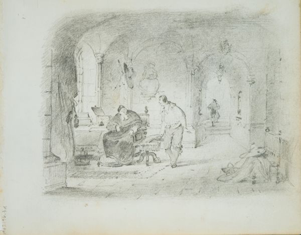 Curator: What an effervescent scene. We're looking at "Study for Dr. Syntax Entertained at College," a watercolor and ink drawing by Thomas Rowlandson, dating back to approximately 1828. It's currently housed at The Art Institute of Chicago. Editor: My immediate impression is of a slightly chaotic but overall amusing scene, filled with linear precision despite the slapstick humor. The palette, subdued as it is, seems crucial to establishing a satirical, rather lighthearted mood. Curator: Absolutely. Consider the interplay between the ink's linearity and the watercolor washes—Rowlandson masterfully uses line to define form and imbue the figures with his signature exaggerated expressiveness, bordering on caricature. The spatial rendering relies heavily on implied perspective. Editor: Precisely. And it’s not just the high-society characters Rowlandson is scrutinizing; it's the labor intrinsically woven into this scene of academic frivolity. Observe how the waiters maneuver through this high-status dining room with such agility that verges on dangerous, possibly revealing class anxieties concerning status and mobility. The fallen figure emphasizes precarious conditions behind social display. Curator: I agree entirely. Note how Rowlandson uses color sparsely and strategically to draw the eye and subtly underscore certain compositional relationships, especially by playing up the gesticulations and grimaces that punctuate the dining table gathering like semiotic codes. He’s pointing to deeper social scripts, one’s embodied position of advantage or precariousness relative to the other’s, with the fallen servant visually mirroring society’s pitfalls. Editor: Furthermore, it's interesting to see what specific vessels these social relations are made visible. This image makes one conscious of consumption habits through various dishes, wine glasses, and barrel that symbolize not only overindulgence, but also serve as commentary of status within class distinctions. Curator: An insightful remark. In conclusion, Rowlandson’s artwork, though seemingly simple, cleverly exploits compositional arrangements and subtly heightened expression to unveil hidden narratives regarding status and performativity. Editor: Rowlandson encourages us to see beyond this comedic surface, urging us to be more conscious about consumption culture reflected here through means of artistic production from early 19th century Britain.