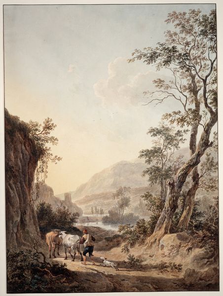 Editor: So, here we have Karl Franz Kraul's "Small village in a valley near the Rhine," a drawing using watercolour and coloured pencils. There's something very serene and picturesque about this valley, a kind of classical landscape feeling. What strikes you when you look at it? Curator: My eye is drawn to the figures populating the scene, each a carrier of meaning within this carefully constructed valley. Do you notice how they’re placed – the walking figures contrasted against those at rest near the cattle? Consider them symbols, acting as a bridge between the viewer and a certain idealized past. Editor: I hadn’t really considered that… more focused on the buildings. So the figures represent this bridge, how so? Curator: These weren’t random placements, think of each object as placed deliberately. Note the presence of religious buildings towering above the valley, a subtle commentary on temporal authority? And doesn’t the receding castle in the distance serve as a vestige of times long past, softened by memory? Kraul may suggest a yearning for something beyond the immediate. Do you feel this effect? Editor: Definitely. Now that you mention it, it is more than a pretty landscape. All the features work together in a story of culture and society that values this kind of peace. The people at rest even seem staged for our viewing. Curator: Indeed. Through the deliberate arrangements of those components, and by tapping into the Romanticism style, the valley becomes more than just a geographical location, doesn’t it? It’s a repository of cultural values that Kraul aims to connect with. Editor: That’s so fascinating; I was really off-track in my initial viewing. I appreciate seeing how the symbolic nature of Kraul’s artwork offers such an insight to historical contexts, reflecting how symbols change or persist. Curator: I concur; this careful consideration for detail really opened new perspectives for both of us today.