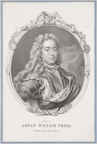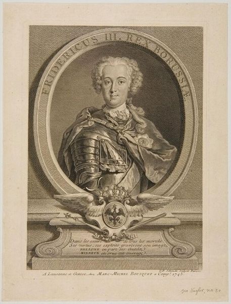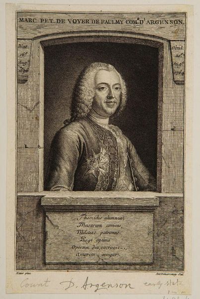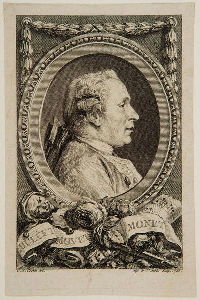 Curator: Let's look at this engraving of Poullain de Saint-Foix by Noël Le Mire. It's from the Harvard Art Museums collection. Editor: What a fascinating face! Almost cherubic, but with a hint of world-weariness. All those frills and flourishes somehow amplify that feeling. Curator: The print medium allows for intricate detail, capturing the textures of fabric and the delicate lines of the portrait. It also speaks to the rise of a print culture and wider dissemination of images. Editor: I love how Le Mire juxtaposes the severity of the oval portrait with all the little details around it; the ship, the putto, the...swans? It feels like a grand, slightly absurd performance. Curator: Absolutely, these visual elements speak to Saint-Foix's life and accomplishments. The material composition and engraving process are also telling about the status and craft of printmaking during this time. Editor: It's a wonderful image; makes you wonder about the man behind the ornamentation. Curator: Indeed. The interplay between subject and visual language really invites speculation.
