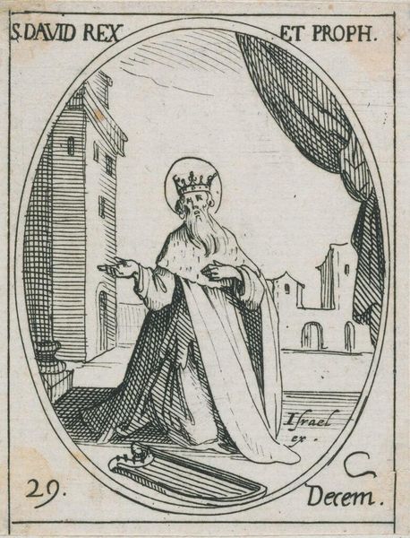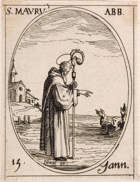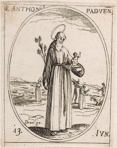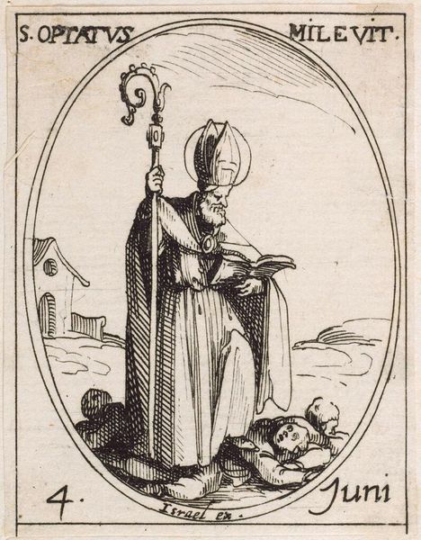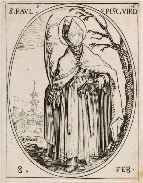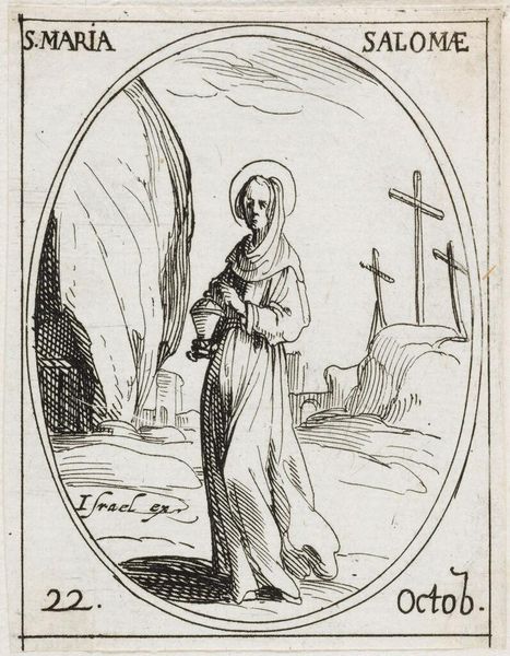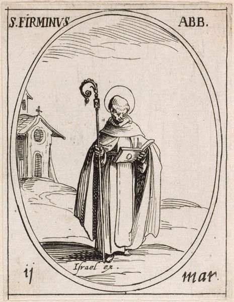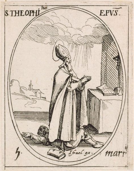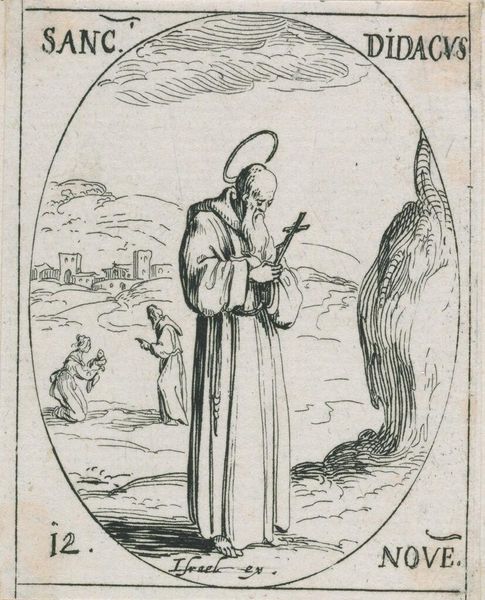 Editor: Here we have Jacques Callot's miniature etching, Saint Elizabeth. It’s quite small, only about 3 by 2 inches. The Saint's foot rests on a little dragon. What do you see in this piece? Curator: I see a fascinating interplay of religious iconography and socio-political messaging. The dragon, likely representing heresy, is subdued by Elizabeth, a figure of piety and, importantly, nobility. Consider how Callot's prints circulated widely; this image reinforces the power of the Church and aristocracy. Is this something that resonates with you? Editor: Definitely. It’s interesting to consider how such a small image could wield so much influence. I hadn't considered the political aspect so directly. Curator: Right. These images weren't just devotional objects; they were tools in a much larger social game. I'm glad we could explore it together.
