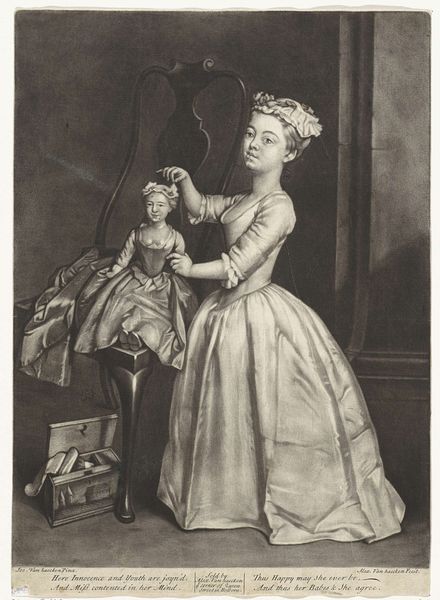 Pieter Schenk created this print depicting a woman seated with a young girl sometime between 1660 and 1711. The delicate gesture of the mother's hand upon her daughter's chin speaks volumes. It echoes the 'ethos of touch' seen in countless Madonna and Child depictions across centuries. The gentle contact transcends mere physical support, suggesting an intimate bond, a passing down of knowledge and affection. Think of classical sculptures where similar gestures convey familial love and protection. But, the bouquets of flowers, emblems of fleeting beauty, introduce a melancholic note. The mother’s touch, while tender, also carries the weight of societal expectations and the awareness of time’s passage. The image evokes a powerful sense of shared humanity, reminding us of the cyclical nature of life and the enduring power of maternal connection, a theme that continues to resonate deeply within our collective psyche.