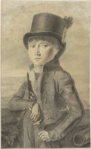 Editor: This is Jacques Louis David's "Portrait of Pierre Sériziat, David’s brother-in-law," painted in 1795. The stark lighting gives it an almost photographic clarity, and I'm struck by the sitter's confident gaze. How would you approach analyzing the composition and form here? Curator: Indeed. Let us observe the geometry: note how the oval format echoes the curve of the hat's brim and is subtly offset by the sharp angles of the coat’s collar. Consider how the contrast between the luminous face and the deep blacks draws our focus, emphasizing the psychological dimension of the sitter's character. How might one interpret David's choice of rendering the fabric of the cravat? Editor: Well, the cravat seems almost carelessly draped, which softens the rigidity we see elsewhere. Is it meant to convey a sense of the sitter's personality or status, maybe a break from the strict formality of the Neoclassical style? Curator: Precisely. Note that the painter does not focus on symbolism or allegory, and therefore relies solely on the posture and dress code as structural devices. David balances a classical, almost sculptural approach to form, particularly in the face, with an embrace of contemporary attire. Editor: So the painting exists in this interesting tension between timelessness and the specifics of its era, reflected in both technique and subject matter? Curator: A salient point. By examining its intrinsic elements – line, shape, light, texture – one is best equipped to decipher this image's significance. Editor: I appreciate how you highlighted the interplay between form and social commentary through stylistic choices. Curator: By analyzing such compositional elements, we're able to view this work in a manner divorced from historical circumstance.