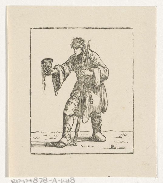 Curator: This etching, titled "Standing Farmer with His Hand in His Mantle", is an artwork dating back to the 17th century by an anonymous artist. It is held in the collection of the Rijksmuseum. Editor: It has a somber mood, doesn’t it? The way the farmer clutches his mantle and turns his head, there’s a feeling of exhaustion and resilience. Curator: It reflects a social landscape of the Dutch Golden Age. While the era brought prosperity, it also carried immense pressures on rural communities, facing issues of labor and economic hardship. The farmer here becomes representative of the marginalized, highlighting the social stratification of the time. Editor: I notice how the artist uses the symbol of clothing to create an expression of this, it drapes to signal tiredness, almost like another character weighing him down in the composition. Curator: Exactly. This piece challenges the common perception of Dutch prosperity. The choice to portray a solitary farmer in simple garb can be seen as an act of protest against the prevalent glorification of wealth, offering instead a reflection on class and the life of labor. Editor: The hat adds an element too – pulled down, shadowed, almost like he is trying to avoid being seen. Symbolically, this adds to his silent protest. It suggests the invisibility of those who work the land. Curator: That's astute. And, from a technical perspective, the etching medium itself emphasizes that vulnerability. The delicacy of the lines and monochromatic palette lend themselves to a portrayal of precariousness. Editor: Indeed. In some ways, the roughness of the etching reflects the harshness of his life. The cityscape, with its tall masts, looming in the distance and adding a contrast between city and rural life and adding to that pressure of industrial development and the changing landscape. Curator: His pose also indicates isolation from any collective structure – leaning slightly away from a cluster of busy-looking workers further back in the scenery. Editor: After our discussion, what strikes me most is that at first glance it might look like just a scene from daily life but when you dig deeper, it becomes something more, something raw and challenging, about who matters in this new golden world. Curator: It prompts us to consider the unacknowledged labor that often underpins progress, challenging the simplistic narratives of history by making clear reference to its complex intersectional realities.