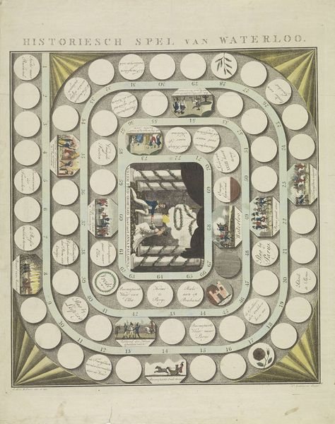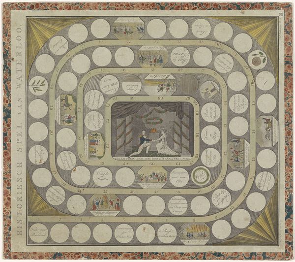 Curator: What a find. Here we have "Spotprent in de vorm van een ganzenbord," created in 1867 by Johan Michaël Schmidt Crans. It's an engraving, a printed drawing if you will. The image is incredibly intricate. What's your initial reaction? Editor: My initial reaction is one of visual overwhelm, I confess. There are so many faces and little vignettes vying for my attention. It reminds me of a game board, and it's not immediately clear how it all connects. It's busy but fascinating. Curator: Indeed! It's intentionally designed to resemble a 'Ganzenbord', a type of goose board game popular in the Netherlands. It mimics the spiraling path, leading to a central point, which of course holds great symbolic importance, often pointing to journey and destiny. The circular formation itself is powerful and implies totality, which perhaps references unity, or points to other recurring cultural symbols within the imagery of the whole engraving. Editor: Thinking of the time period, 1867, this could very well be a commentary on the political or social landscape. The little 'windows' with portraits give off the sense that the actions of people behind closed doors shape a national journey of the goose game board. What about that prominent figure near square 23, almost draped theatrically across a portion of the game, acting like a border to keep players in? Curator: Precisely! I'm drawn to that figure as well; such prominence! In iconography, the cloak could signal authority. Editor: Authority perhaps challenged or satirized. Given the caricature-like style, it hints that Crans probably had a perspective on figures of power. The imagery resonates with other satires found during periods of political tension, a powerful form of public critique back in the day, circumventing outright opposition to policies that could come with very severe punishments. Curator: What I find truly striking is the use of a game as a format. Games, in many ways, serve as metaphors for life and destiny. I imagine it encouraged the piece’s viewers to look at their society critically; almost a game of fate. Editor: Agreed, it definitely gives people room to reconsider assumptions. Spotprent is a real gem of the collection for me. Curator: The complexity of visual symbolism really allows me to explore multiple meanings with this piece. Thank you.