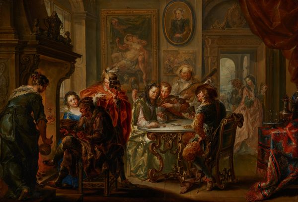 Curator: Here we have Jacob Jordaens' "As the Old Sang, so Pipe the Young," painted in 1638. It presents a bustling family scene rendered in oil on canvas. What are your first thoughts? Editor: Chaotic! There's so much activity vying for attention: instruments, food, expressions of various ages. I'm struck by the lack of conventional beauty; everyone is realistically... imperfect. Curator: Indeed. The title itself points to the continuity of tradition and the way values are transmitted across generations. Musicality serves here as a metaphor. Look closely; the phrase “Soo d’oude songen, soo pepen de jonge” is inscribed in the painting itself. Editor: The dog reaching for the food on the table feels very much like it should be the central focus of the entire painting. The dog feels at the margins both visually and conceptually. But I wonder about the power dynamics within this seemingly merry scene. Note how women are centered within a very patriarchal time. Curator: Observe how carefully Jordaens uses specific iconographic symbols related to age. The older generation represents the wisdom of experience but is shown here, perhaps, as struggling to maintain its grasp, represented here by their poor vision. Editor: I find the lack of idealization almost subversive. It flies in the face of typical portrayals during that period. In positioning art this way, this almost operates as early photography. Do we even understand the socio-economic reality? Is it merely a glimpse into upper middle class norms? Curator: Possibly. It's a moralizing genre scene intended to provoke consideration of values—the rewards and shortcomings of tradition and how they relate. This symbolism transcends time. We always inherit certain baggage as well as certain advantages from past practices and conventions. Editor: Thinking about the "baggage" here I also sense a hint of generational tension—the youthful energy contrasted with the established order. A dog devouring food is probably another moral parable about class tensions in Europe. It does make me wonder how different contemporary depictions of families and inheritance will be perceived centuries from now. Curator: It really highlights how representations can change over time while simultaneously demonstrating something elemental about intergenerational influence and exchange. It's always exciting to witness these old scenes speak to us from the past and teach about our cultural continuity and memory. Editor: Ultimately, I leave this image pondering what truly carries across time, what fractures, and what biases inform our perception. I hope it has helped others reflect on family as a vehicle for change.