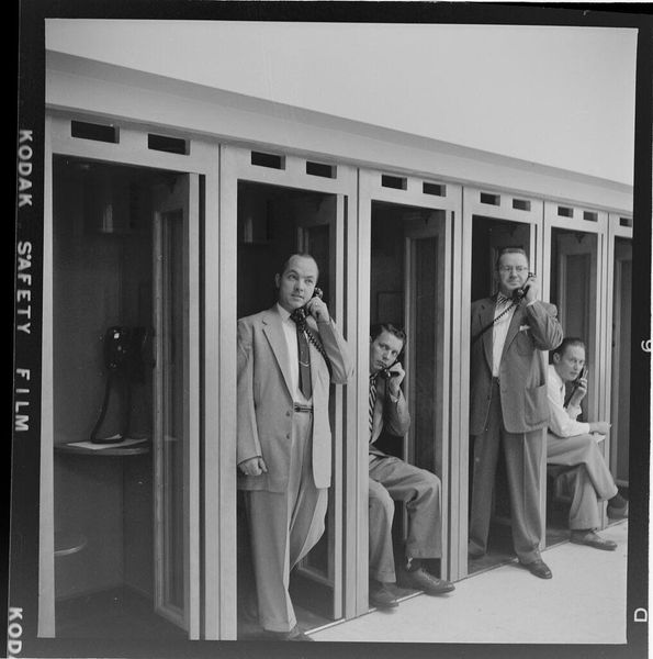 Editor: This photograph, titled "Untitled (children playing dress-up and walking baby carriage on sidewalk)" by Jack Gould, captures a moment of childhood imagination. I'm struck by the stark contrast and how it almost feels like a scene from a play. What do you see in this piece? Curator: For me, it's all about the power of play and how children construct their own realities. The formality of the dress-up clothes, juxtaposed with the everyday sidewalk, creates a beautiful tension. It makes you wonder what stories they're telling themselves, doesn't it? What do you think? Editor: It does! It's like they've built a whole world. It's interesting how such a small image can evoke something so big. Curator: Exactly! It's a little portal. Gould has captured a universal human experience. I love that.