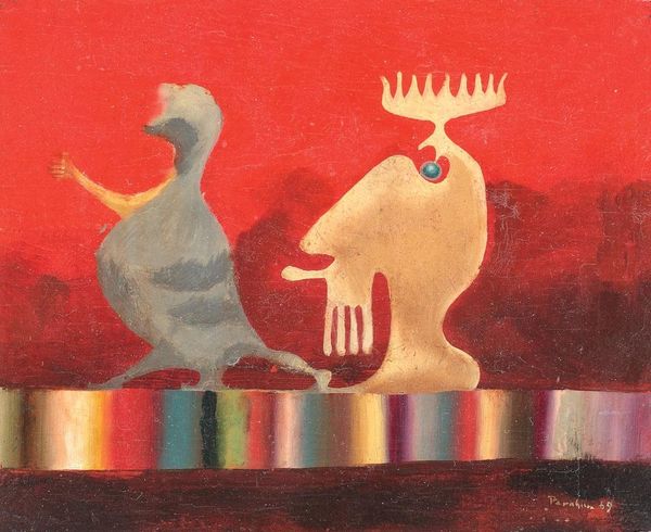 René Magritte made "The Triumphant March" with oil on canvas, though when exactly is a mystery. The muted palette and blended forms suggest a process of layering, of veiling and unveiling. The surface is pretty smooth, without much impasto, and the figures are built up with subtle gradations of tone. Look how he’s handled the fleshy colours in the central figure – this long, bulbous form that seems to emerge from a high-heeled shoe – it's like he’s animating the inanimate, giving it a grotesque, almost comical life. That carefully rendered moustache is so out of place that it brings a strong element of the absurd to the painting. Magritte's playful approach reminds me a bit of Philip Guston, but with a darker, more surreal twist. Both artists invite us to question our perceptions and to embrace the enigmatic nature of art.