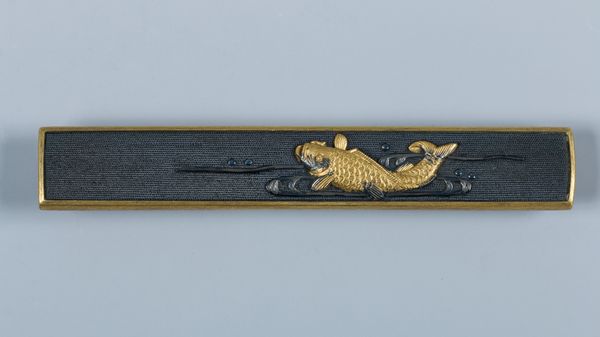 Curator: It strikes me as a very compressed battlefield drama, everyone squeezed together, jostling for space on this small rectangle. Editor: Precisely. We’re looking at a "Kozuka," or knife handle, created by Gotō Eijō sometime between 1550 and 1650. These small, often ornate, handles adorned the utility knives carried by samurai. Considering that time frame, imagine the artisan and the warrior, each in their sphere. Curator: It's compelling how these figures almost become abstract shapes. What at first seems chaotic begins to coalesce into distinct forms once you look closer—each a little warrior engaged in the act of war, armor gleaming, weapons raised. The dark background throws them into stark relief. Editor: Notice the selection of metal. The interplay of gold, silver, and perhaps a darkened copper or bronze... these choices wouldn’t just have been aesthetic. They spoke to value, status. And then think of the intensive labor. This wasn't a single material forged into shape, but various inlays carefully hammered, polished... a micro-engineering project. Curator: Agreed. And in that precision, a deeper symbolic meaning emerges. Beyond the representation of battle, consider the virtues the samurai class would ascribe to such meticulous craft. It mirrors discipline, honor, and commitment—qualities they sought to embody. The Kozuka is not just decorative; it's a portable reminder. Editor: Indeed. I'm particularly curious about how wear and tear affected the meaning and experience of using it over time. A scratch, a slight discolouration… Did this then change the owner's understanding of its martial symbolism? Did it become almost a talisman, infused with specific, hard-won victories, maybe even defeat? Curator: It also offers insight into the artistry valued within that society, these miniature narratives speak volumes about their reverence for craftsmanship. The fact these Kozuka handles often outlast the blades themselves makes you wonder how those changing relations over time affected our view on craft itself, not necessarily fine arts as one may see. Editor: Food for thought, really. It takes art and craft to make an item of daily use for the noble class that then echoes throughout time in museum spaces as items for aesthetic evaluation. I see this "Kozuka" is then also the mark of shifting hands—artist, warrior, and us. Curator: An echo of craftsmanship resonating through history, transforming battle into a testament of skill and a reflection of social values—quite striking. Editor: Exactly. Next time, let's see if we can unravel another such story of making.