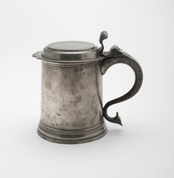 Editor: Here we have an 18th-century tankard, likely made by Richard Going. The tankard is crafted from metal. Its smooth, gray surface feels reserved yet sturdy. How might we interpret this object in a broader context? Curator: That’s a wonderful point. A tankard, seemingly simple, is rife with cultural information. What might this tankard tell us about class and consumption in 18th-century society? Editor: Well, the material suggests some level of affluence. Was metal a common choice for all social classes, or was it reserved for the elite? Curator: It's interesting to think about material value but beyond this, how does it become an important carrier of ritual and custom for a society? How is status asserted and communicated in drinking rituals? Editor: That's a new perspective for me, this tankard representing ritual! It shows how an everyday item embodies so much about social hierarchies and daily lives. I never considered how objects create communities. Curator: Exactly. And what stories are missing? Whose hands crafted it? Whose labor extracted the metal from the earth? We must interrogate these silences. Editor: Thank you for widening my perspective! Considering those absences definitely brings this simple vessel into much sharper focus. Curator: Likewise! It’s crucial to constantly re-evaluate these objects, allowing them to challenge our perceptions of the past.