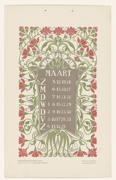 Editor: So, this is “Kalenderblad mei met bloemen,” or "Calendar Page May with Flowers", believed to be from before 1905, created by Anna Sipkema. It’s a poster and a print, incorporating typography, so almost like decorative art. I love the geometric lines entwined with the leaves, so very Art Nouveau, right? It makes me wonder, what was the role of such decorative arts and printed calendars within Dutch society at the turn of the century? Curator: That's a fantastic question. These types of decorative calendars were part of a larger movement aimed at integrating art into everyday life. Mass production was booming, but this was trying to counter the dehumanizing effect through artistic expression. This poster offered a visual escape, presenting an idealized nature, didn’t it? It also served the practical purpose of organization – bridging art and functionality. Considering that, who was it really for? Editor: I see your point. While aesthetically pleasing, a printed calendar seems inherently linked to commerce or public information. Maybe businesses used them to advertise, or maybe even schools and government organizations. The accessibility of mass print made disseminating information far easier than by paintings displayed in galleries. Curator: Precisely. Art Nouveau, even in this form, aimed at democratizing art. Rather than existing in rarefied spaces, art was now intended for a wider audience, blurring the boundaries between commercial and artistic pursuits. Do you think it challenged the establishment view of what "art" should be? Editor: Absolutely! I'd argue things like posters began paving the way for popular art, especially with wider distribution. It raises a key question: where do you draw the line between craft, design, and high art? Thank you; I’ll be chewing on that concept all day. Curator: And the very act of displaying a calendar in one’s home can be seen as a quiet act of participation in contemporary visual culture. We are all participants to the system, and its influences can appear in unexpected forms, like calendars!