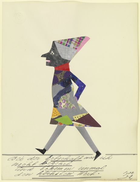 Editor: This watercolor drawing by Chris Makrenos, made sometime between 1935 and 1942, is titled "Two-Headed Freak." The subject matter is quite unsettling! I'm struck by its stark portrayal of... well, a rather grotesque puppet-like figure. How do you interpret this work? Curator: This piece offers a rather poignant critique of societal power structures and the concept of the "freak show." What do you observe about the puppet's construction? Its materiality, in other words? Editor: The puppet has a very rigid, almost mechanical feel to it, with stark color contrasts. The faces seem almost mask-like. It's bizarre and yet somehow familiar. Curator: Exactly! The stiff, segmented body and the garish faces highlight the artificiality of performance. Consider the historical context – the 1930s and 40s were marked by social upheaval, the rise of totalitarian regimes. Do you see connections between this manipulated figure and the controlled image often presented by those in power? What commentary might Makrenos be making on the performance of identity? Editor: It’s almost like the figure represents how individuals can be manipulated or how they are forced to perform certain roles dictated by society. The two heads seem to suggest conflicting personas perhaps? Curator: Precisely! Think of Du Bois' concept of double consciousness – the internal conflict of seeing yourself through the eyes of a prejudiced society. Might this “freak,” displayed and controlled, embody such a struggle? It pushes us to question who defines "normal" and the consequences of societal expectations on individual identity. Editor: Wow, I hadn’t thought of it that way! I was stuck on the "freak" part, but I now appreciate how it uses the grotesque to engage with societal control. Curator: Yes! Art like this challenges us to look beyond the surface and to consider the complex intersections of identity, power, and representation. It certainly reframes how I view performativity and social expectation!