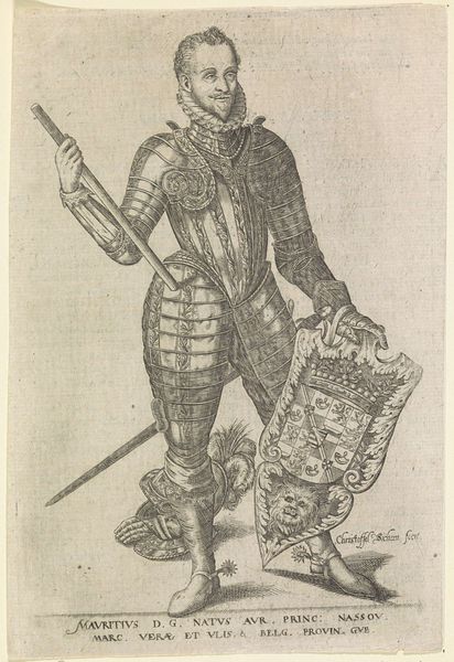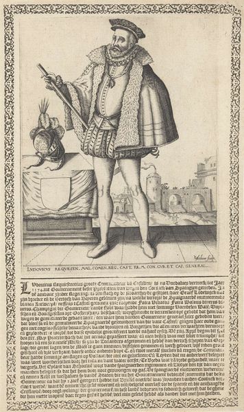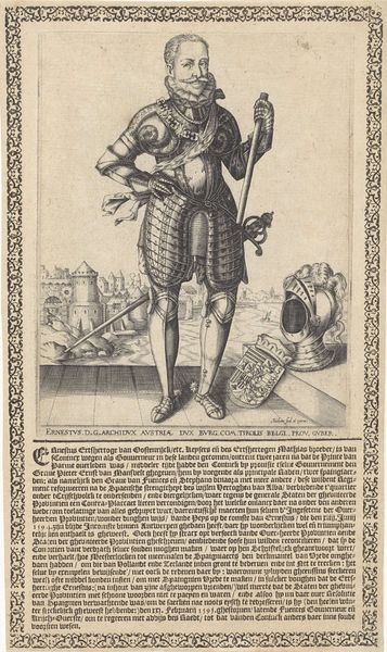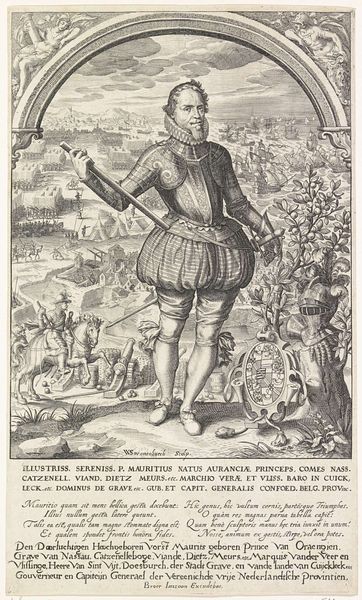 Editor: This is a fascinating engraving, "Portret van Fernando Alvarez de Toledo, hertog van Alva," from 1611 by Christoffel van Sichem I, currently at the Rijksmuseum. The Duke of Alva is rendered in meticulous detail, yet I can’t help but notice the almost claustrophobic detail packed into the frame, from the maps and corn cobs, to the armor and elaborate helmet on the table, and even a decorated text block. What exactly am I supposed to be focusing on? What draws your eye? Curator: You know, that visual overload is, in a way, the point. This isn’t just a portrait; it's a carefully constructed argument about power, influence and new crops arriving to the old world from across the Atlantic! Consider Alva's role – a powerful military figure during a turbulent time in Dutch history and Europe during the 30 year war! Editor: So, it's less about Alva the person and more about Alva as a symbol of Spanish power? The helmet is very eye-catching. I also spot the armaments and war implements on his desk. Curator: Precisely. The inclusion of the helmet, the table bearing his family's coat of arms, along with what looks like the siege of a city! It's all carefully staged theatre of potency and success. But notice something more; the text, his portrait and the setting tell a story. What might that story be telling, or perhaps not telling? Is that portrait and scene flattering, accurate, or self-aggrandizing? Is Alva really who he projects himself to be here? Editor: That’s a great question! Now, looking at all these elements collectively, it’s starting to read less like a straightforward depiction and more like a… well, a propaganda piece. Curator: Spot on! Now, that changes the whole perspective, doesn't it? An aesthetic interpretation based on context makes you look deeper, to explore the hidden stories paintings carry, often concealed beneath the veneer of artistry! And, in the same sense, understanding artistic intents might teach us lessons about truth, bias, intention, propaganda, etc. that are also essential for other walks of life! Editor: Definitely, I will never see a portrait the same way again! Curator: It goes to show, doesn't it? There's always more than meets the eye!