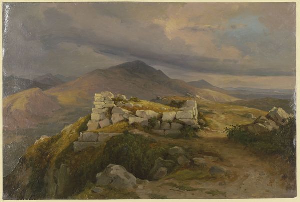 Editor: So this is William Trost Richards' "Paradise, Newport" from 1877, a watercolor drawing capturing a very picturesque landscape. The first thing that strikes me is the sheer tranquility, it almost feels like looking into a dream. How do you interpret this work? Curator: It’s interesting you use the word dream because landscapes have long served as projection screens for cultural anxieties and utopian desires. This scene, bathed in soft light, shows both grandeur and serenity, reminding us of the Romantic ideal of the sublime. It suggests that Paradise isn’t necessarily a far-off place, but exists within the American landscape. Note the placement of those grazing sheep, very common. Do you notice any recurring motifs of pastoral life? Editor: I guess so, sheep symbolize innocence and peace in lots of artworks? Is there something specific here? Curator: Precisely. Sheep, especially in idyllic scenes, harken back to classical pastoral traditions, evoking a sense of harmony between humans and nature. But here, I also see it intertwined with American notions of westward expansion and stewardship of the land. It presents the American landscape as both a new Eden and a space ready for cultivation, even ownership. Editor: So, this beautiful landscape is communicating ideas of possession and expansion? I never would've guessed. Curator: Symbolism often layers itself across centuries. Richards masterfully uses the romantic language of landscape to evoke complex ideas about national identity and cultural memory. Consider the contrast between the rough, untamed rocks and the domesticated sheep— a visual representation of this ongoing dialogue between wilderness and civilization. Editor: I'm seeing the painting in a completely different light. I had assumed it was just scenery, not a meditation on cultural memory! Curator: And that’s the power of images. They echo with the whispers of history, if you know how to listen.