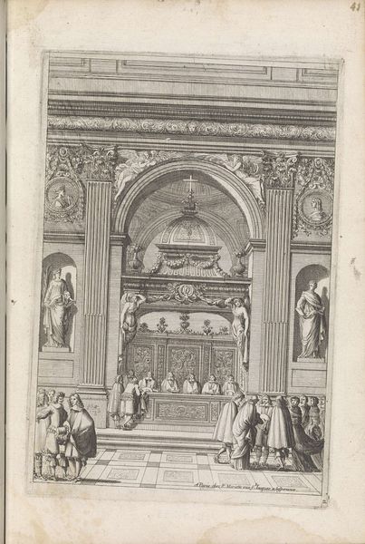 Curator: What a grand vista! We're looking at "Galerij van een paleis met een kroonluchter," or "Gallery of a palace with a chandelier," an engraving by Jean Lepautre from 1659, currently held at the Rijksmuseum. Editor: It's stunning how he captures that echoing vastness with just lines! Makes you feel utterly small, like you’re about to get swept away by a polite, but powerful, Baroque wind. Curator: Lepautre, working firmly within the Baroque style, certainly intended to evoke that sense of awe. Consider the symbolism present here: the vanishing point perspective drawing your eye deep into space, combined with the magnificent chandelier that suggests enlightenment and grandeur. Editor: Right, there's that light! But there's also the sense that everything's staged, like we're peering into a theatrical set. Even the little gathering of figures seems performative. Curator: Exactly! Baroque art often acted as propaganda. Here, the palace represents absolute power. The very architecture is designed to impress upon visitors the might and glory of the patron. Notice how even the distant figures almost seem to fade into insignificance? Editor: Good point! The figures actually make the space, they give context of that overwhelming size. They feel a bit lost actually. Is this a reflection of the ruling elite's perception of common people? Like extras in their drama? Curator: Possibly! In this period, palaces were not just residences; they were stages upon which power was visibly enacted. The architecture and art served as constant reminders of social hierarchy and royal authority. This imagery certainly highlights the Baroque focus on grandeur and the controlled display of authority. Editor: The overall sensation makes me uneasy, strangely. While it celebrates beauty and scale, there’s also the subtle impression of alienation and rigid control... I find it overwhelming. What about you? Curator: I can appreciate that. While dazzling on a surface level, that psychological tension between individual and state power resonates even today. Editor: A pertinent piece indeed; something to be cognisant of.