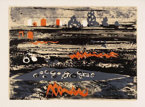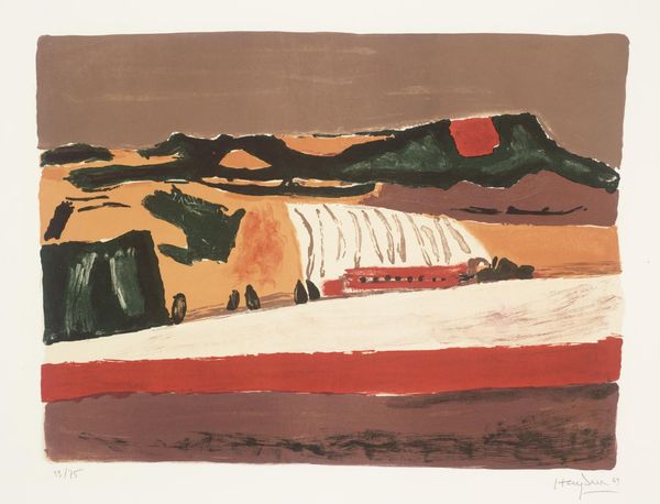 Editor: Here we have Henri Hayden’s "Untitled (Blue Landscape)" from the Tate collection. I am struck by how the bold color blocks flatten the picture plane. What do you make of this print? Curator: Well, Hayden was a Polish artist working in France, engaging with cubism early on. How do you think the politics of representation might be at play here, considering the rise of abstraction during times of social upheaval? Editor: That's interesting! It makes me wonder if this simplification of the landscape is a kind of visual commentary. Curator: Precisely. And think about the accessibility of prints versus unique paintings. Who gets to own and display such imagery, and what does that say about its intended audience? Editor: I hadn't considered the social implications of printmaking. It definitely adds another layer to the work! Curator: Indeed. By questioning the role and audience of art, we deepen our appreciation for its complexities.
