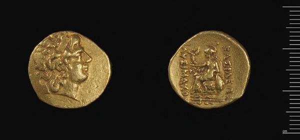 Curator: This is a drachm of Agathokles, Tyrant of Syracuse, currently held in the Harvard Art Museums. Editor: It's gorgeous! All that shimmering gold in such a tiny space. It makes me think of power and ancient stories. Curator: The coin features a detailed portrait in profile, likely depicting Agathokles himself. Editor: And on the other side, a chariot! There's so much energy in that image, like you can almost hear the horses thundering by. It's like a miniature epic poem captured in metal. Curator: Indeed, the use of such imagery was likely a calculated decision to project an image of strength and authority. Editor: It’s amazing how something so small can convey so much. I keep thinking about who held this, and the world they inhabited. Curator: A potent reminder that even the smallest objects can hold immense historical and cultural significance. Editor: Exactly! It’s more than just gold; it’s a connection to the past.