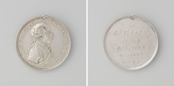 Curator: Let's turn our attention to a piece dating back to 1789: a bronze intaglio medal that immortalizes Michal Oginski, emissary to the Netherlands from Stanislaus II Augustus Poniatowski, the King of Poland. Editor: There's a striking formality here, isn’t there? The monochrome effect combined with the texture of the metal creates such a palpable sense of gravity and history. Curator: Absolutely. Its existence testifies to the fascinating dynamics of power, diplomacy, and identity in late 18th-century Europe, especially regarding Poland’s efforts to establish a presence on the world stage. How does Oginski's role as a diplomat for a weakening Polish kingdom influence our understanding? Editor: The means by which a person’s identity was cast and immortalized holds significance here. The medal, as a material object, was clearly intended to circulate—a controlled distribution, a means to propagate and solidify Oginski's status. The material—bronze, through engraving—became synonymous with the political. Curator: And considering the historical context, this medal also prompts critical questions around the legacy of colonialism and representation. As an object produced within European power structures, what biases might be present? How do we negotiate a reading of Oginski's representation as an artifact marked by the very political structures he navigated? Editor: Right. The circular format reinforces its functional aspect, it was to be held, touched, passed on. What does it mean to create these miniature sculptures en masse to portray power at a time when royal authority was in crisis, as well as artistic craft and metal production itself? It asks how that labor is involved in this assertion of diplomatic power. Curator: Looking at this, I'm thinking about how artworks of the era actively reinforced political narratives. The clean, classical style further idealizes and elevates Oginski in ways that would serve Poland's political agenda. It begs a deconstruction of the visual strategies used to affirm identities. Editor: Absolutely. We must never disregard these artifacts simply as passive portraits of figures and the social circumstances around those who commissioned it. By drawing together a meticulous analysis of its purpose, method and materiality, this approach has made its history much richer for me. Curator: And I agree, situating Oginski’s medal within intersectional frameworks, acknowledging the power relations inherent to its production, reception and broader socio-political implications helps foster dialogue around how identity and nationhood continue to be mediated through visual culture today.