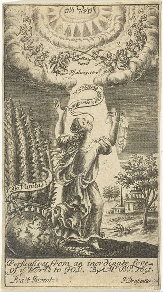 Sigmund Gabriel Hipschmann created this print, "Grave Monument for Mr. Hoeffel," in the 17th century, a time when the visual representation of grief was highly ritualized. Prints such as these were often commissioned by the family, not just as a memorial, but as a statement of status. This work is filled with allegorical imagery, from the angel bearing the family crest, to the landscapes to either side of the monument, filled with symbols. The Hoeffel family is literally placed on a pedestal. The monument is crowned by an image of the deceased and festooned with foliage, signaling a life lived that continues to grow in the afterlife. The Latin inscription makes explicit that the monument has been erected as a trophy. As such, we can consider the way in which the monument performs grief while simultaneously solidifying the family’s place within a hierarchical society.