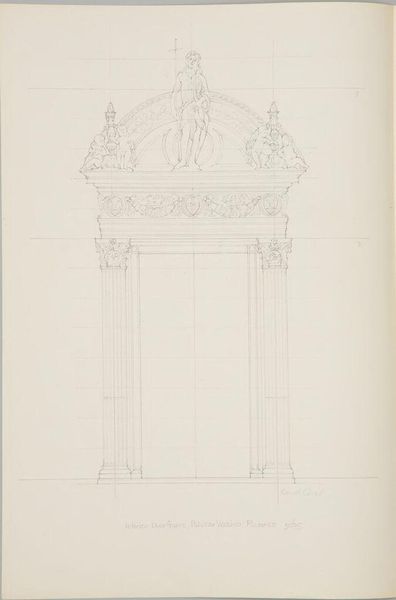 Editor: This is Kenneth John Conant's drawing of doorway carvings at the Pazzi Chapel in Florence. The precision is striking, like a mathematical equation made visual. What do you see in terms of its composition and line work? Curator: The rigid structure immediately speaks to the Renaissance ideals of order and proportion. Note the meticulous grid underlying the drawing; it's a testament to the period's emphasis on geometric harmony. The carvings themselves, while detailed, are contained within this framework. How does this tension between ornamentation and structure strike you? Editor: I appreciate the way the artist uses line to define form and space. It's all very controlled. I guess I see how the grid becomes part of the beauty itself. Thanks! Curator: Indeed. Considering form in such a fundamental way allows us to perceive beauty and precision in a new light.