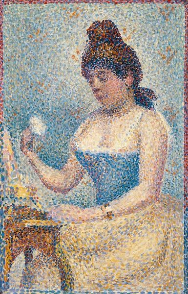 Jean Metzinger made this painting of a seated woman holding foliage, Femme assise au bouquet de feuillage, at an unknown date, using what looks like a pointillist technique. It's like the whole thing is made of tiny dots, a real labour of love, or maybe a kind of madness! Looking closely, the colors are so vibrant. He’s using this mosaic of touches to build form and light. The skin has this radiant glow, achieved through yellows, pinks, and even hints of blue. Metzinger isn't just painting what he sees, he's constructing a new way of seeing. Notice the area just above her right arm, the yellow melts into little strokes of blue, so close together they fizz and vibrate like TV static. I'm reminded of Seurat or even Cezanne here. It's all about seeing the world, not as a fixed thing, but as a fluid, ever-changing process. There's no single way to look at this painting, it’s alive with possibilities, and that's what makes it so exciting.