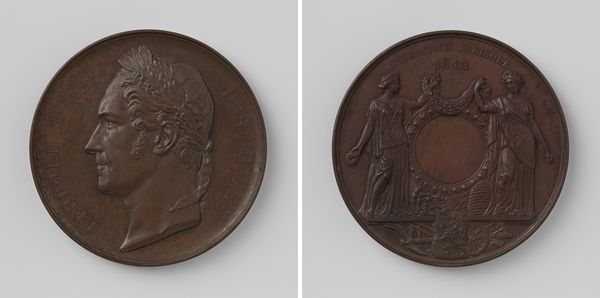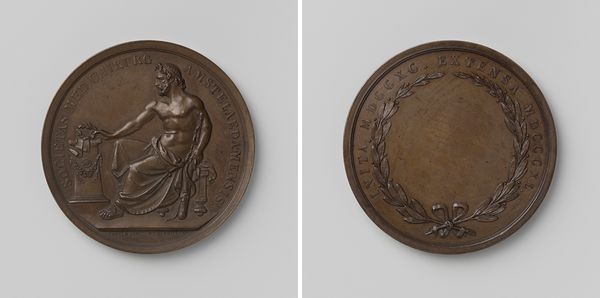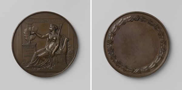 Editor: This is a bronze medal, “Provinciaal Genootschap van Kunsten en Wetenschappen in Noord-Brabant,” created in 1839 by David van der Kellen. I’m struck by the crispness of the relief and how symbolic the imagery is. How might we unpack the significance of its materiality and its historical context? Curator: It's important to see this medal not just as an object, but as a product of a specific production process embedded within the economic and social structure of 19th-century Netherlands. Bronze was a deliberate choice. Were alternatives available, such as cheaper metals or even glass? What statement was the commissioner trying to make using this medium? Editor: That's interesting. I hadn’t thought about bronze being a deliberate choice, as opposed to simply traditional. I suppose its relative durability and associated cost signals something about the importance of the awarding organization, as well as the perceived permanence of knowledge and art? Curator: Exactly! Consider too, the labor involved. The skills of the die cutter, the foundry workers – they are all part of the meaning. The neoclassical style speaks to the intellectual aspirations of the era, invoking classical ideals of knowledge and civic virtue, yet created by 19th-century hands under specific working conditions. And this was replicated: understanding who had access to it also unlocks this medal's social context and implications. Editor: So, the medal’s meaning isn’t just about the imagery, but also the industrial and economic systems that made it possible. That's such a helpful reminder to consider the full picture. Thanks! Curator: Absolutely. It moves us beyond mere appreciation of design towards a broader understanding of the society it served and from whence its material substance was drawn.
