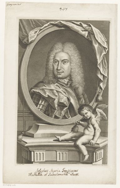 Curator: Editor: This is a print from somewhere between 1715 and 1759 entitled "Portret van Johann Heinrich Lochner," made with engraving by Georg Daniel Heumann. I am really taken by the contrast between the formal portrait of the man and the cherubic figures adorning it. What’s your take? Curator: I see a confluence of power, status, and mortality, typical of Baroque portraiture intended for a learned audience. The sitter is framed within a carefully constructed visual and symbolic language that communicates specific ideas about who Johann Heinrich Lochner was and what his position in society was. Given the inclusion of cherubs and skulls, what statement is being made, and who is the audience? Editor: That's a great question! I notice the cherubs, very light and airy, and then the skull right beneath Lochner's image. The portrait is also framed by foliage, making me think about the fleeting nature of life. It’s a dramatic contrast. Curator: Exactly. This piece is meant to operate on multiple levels. The inclusion of both classical elements—the cherubs, the Latin inscription—and explicit symbols of death, or *memento mori*, was fashionable in depicting learned individuals in the 18th century. The Baroque loved the theatrical. Do you think the skulls may symbolize a medical professional? Editor: Perhaps? If he was a physician, that certainly adds another layer. It’s fascinating to see how art reflects the social status and aspirations of its subjects and how this intersects with ideas about death and remembrance in public imagery. Curator: Indeed. The social function of the piece within its time offers an engaging insight into the subject and values of his community. Editor: I didn’t think about that initially, but your framing is definitely interesting and has really altered my view! Curator: Likewise; your close read of the visual contrast made me consider how stark those visual dynamics really are!