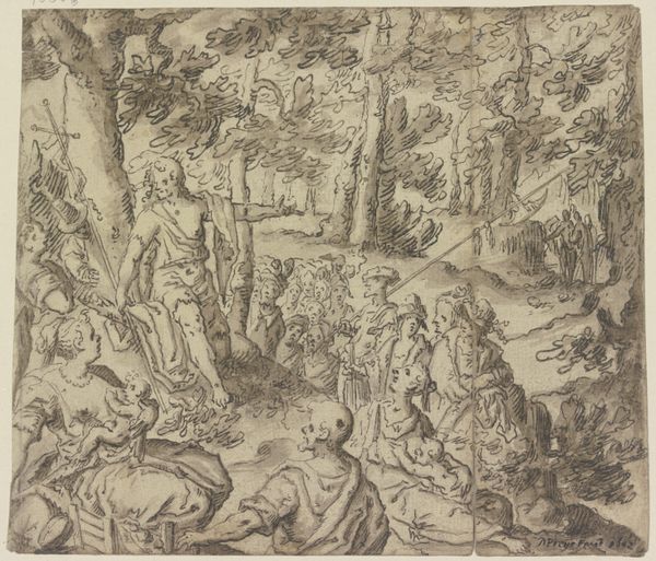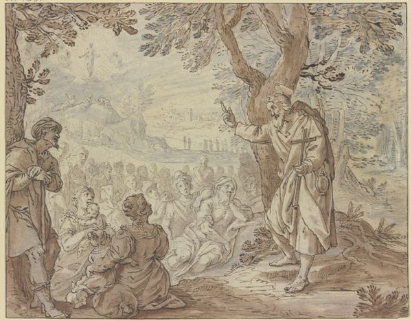 Curator: This is a fascinating watercolor drawing, "The Preaching of Saint John the Baptist," crafted by Gerrit Pietersz sometime between 1598 and 1604. It now resides here at The Met. Editor: What strikes me immediately is the almost dreamlike quality. The blues and browns... it's faded, or perhaps intentionally muted, lending a hazy feel. The gathering seems far removed from us in their focused listening. Curator: Yes, and notice how the use of watercolor gives it an airy, almost ephemeral quality. I wonder, what paper was available? What were the societal demands in artistic training or labor for a piece like this? Were these watercolor pigments derived locally? All things to think about for the conditions of creating an artwork such as this one. Editor: An interesting idea. What catches my eye, too, is the grouping of figures to the right. Is that a family, watching the sermon from afar, seemingly detached? A wealthy benefactor? Curator: I see what you mean, but isn’t it compelling how Pieterz utilizes landscape—that broad, slightly indistinct backdrop—not just as setting, but as an emotional stage? The northern renaissance focus is truly impressive when he is working within the means of readily available material culture for pigments and the skill of laborers making paper. Editor: You're right. It’s a skillfully crafted landscape that gives that open sky behind the crowd so much significance; all of it feels like a great precursor to more complex techniques yet to come. One also wonders how patronage for the materials might have further propelled his creativity and technique here? Curator: The use of available materials here emphasizes an economy of artistic labor in such Northern Renaissance-esque biblical paintings. So much is emphasized simply from looking at how this artist has to pull from accessible local material sources. I always learn so much every time I pass by. Editor: I feel so close to this moment and time, like this artwork offers so many little mysteries to engage with and reflect. Thanks so much for pulling this back to the materiality to the era!