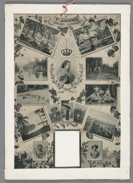 This page from "The Madame B Album" by Marie-Blanche Hennelle Fournier presents a carefully arranged collection of photographs within a decorative border. The composition is structured around a central landscape, with smaller portraits and architectural scenes forming a frame. The sepia tones of the photographs contrast subtly with the pale, marbled effect of the surrounding paper, creating a visual rhythm that guides the eye. The arrangement suggests a personal narrative, a curated selection of images that invite viewers to piece together a story. Each photograph, enclosed in geometric shapes, acts as a signifier, hinting at social connections, personal identity, and spatial context. The overall structure operates almost like a visual language, where the placement and juxtaposition of images create layered meanings. The album page destabilizes the traditional portrait by embedding it within a matrix of landscapes and monuments. This interplay between public and private, personal and monumental, encourages ongoing interpretation and a deeper engagement with the represented subjects.