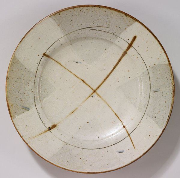 Editor: Here we have Otto Lindig’s "Cake Plate" from the Harvard Art Museums. It's a simple circular form, but the glazing creates such a nuanced surface. What symbolic weight might a seemingly mundane object like this hold? Curator: Consider the circle, Editor. Universally, it represents wholeness, eternity, and cycles. Does the plate's imperfection, the slight crack, disrupt that symbolism, or perhaps, deepen it? Editor: That's interesting. It makes me think about the Japanese concept of wabi-sabi, finding beauty in imperfection. Curator: Precisely! The crack and the glaze variations become part of its story, embedding memory and use. Does this shift your understanding of its function? Editor: It does. I see it less as a simple plate and more as a vessel of experience. Curator: And that, my friend, is where the ordinary transforms into the extraordinary.