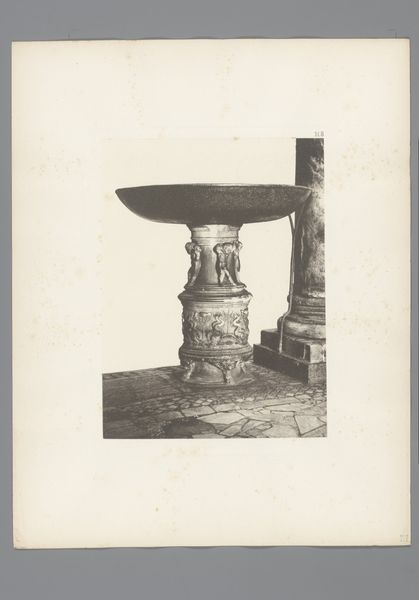 This is a black and white photograph by Carl Heinrich Jacobi, titled "Sokkel bij de San Marco in Venetië." The image is dominated by architectural forms, specifically the base, or socle, of a column near San Marco in Venice. The photograph's composition is strikingly simple. Jacobi directs our attention through the stark contrast between light and shadow, which models the cylindrical form of the stone. The photograph invites contemplation on how historical structures embody cultural memory. Here, the column base, captured in a seemingly objective manner, subtly destabilizes any fixed notions of time and permanence. Consider how Jacobi uses photography – itself a relatively new medium at the time – to engage with classical forms. It prompts us to think about the relationship between representation and reality, between the fleeting nature of the photographic image and the enduring presence of classical architecture.