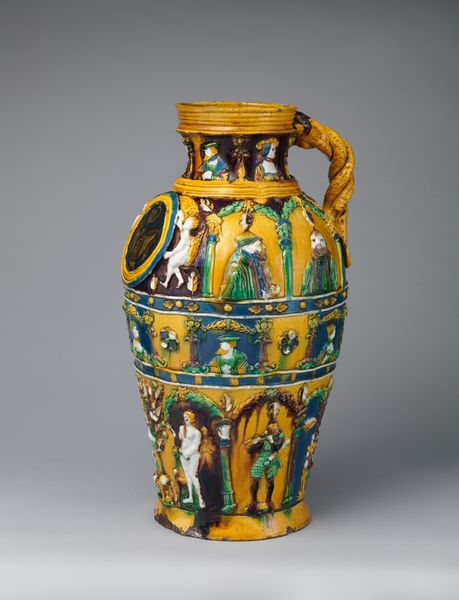 Curator: What strikes me most about this ceramic vase, created in 1879, is its overt ambition. It resides here, at the Metropolitan Museum of Art. Editor: I'm drawn to the ornamentation—it feels heavy, burdened even, by layers of floral and geometric motifs. Curator: The ceramic material certainly lends itself to the meticulous detail. We should consider that making a piece such as this involved highly skilled labor, where specialization was everything. The cost of ceramic during this time places production like this within reach of specific demographics, those who had access to materials. Editor: I see this elaborate surface design not merely as decorative excess, but possibly reflecting anxieties surrounding rapidly shifting class structures in the late 19th century. Curator: Anxieties or aspirations? Or perhaps even the complex, layered glaze serves as a visual metaphor for societal complexity during industrialization, which is also rapidly developing throughout the West at the time? Editor: Precisely! Consider, too, the vase form itself and how it invokes historical notions of classical elegance, all the while being reinterpreted through a Victorian lens and mass culture and emerging design philosophies. It highlights cross-cultural references. Curator: Yes! What this object allows is not just seeing how artists could shape the very material itself but to understand the social forces—both literal and conceptual—that are informing design during the period, like material availability, or access to tools and techniques, and those with knowledge on hand. Editor: And maybe understanding how something utilitarian transforms under the pressure of aesthetic movements and evolving class dynamics can help us examine value judgments, which persist in today's market. It reveals subtle assumptions within what constitutes a “high art object” compared to design, folk art, or even craft. Curator: I think it is quite impressive how so much labor has translated into the details across the surface, making the process evident. The symmetry of the vase with its applied decorative flourishes offers an invitation to engage with both a practical object elevated to art, and to learn about an entire community's output through materiality. Editor: Right! By understanding an object’s construction and reception, and being attuned to the culture around the artwork, that might guide us to reconsider art’s perceived purpose in society today, whether for pure contemplation, activism, commerce, or, all three.