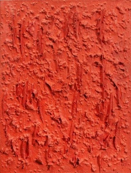 Here we have a Study by Simon Hantai, a canvas dominated by a vibrant red and white pattern. This isn't a painting of something but rather an exploration of painting itself. Notice how Hantai has used the technique of folding and crumpling the canvas before painting, a method he called "pliage". The red dye saturates the canvas, while the folds resist the paint, leaving behind stark white areas when the canvas is unfolded. What interests me is how this method disrupts traditional ideas of composition and authorship. The pliage technique introduces an element of chance and automatism, challenging the artist's control and pushing the boundaries of what it means to create an image. The interplay between the intentional act of painting and the random, uncontrolled folding creates a complex and captivating surface. It challenges us to reconsider how meaning is constructed in art. Is it the artist's intent, the process, or the viewer's interpretation that ultimately defines a work?