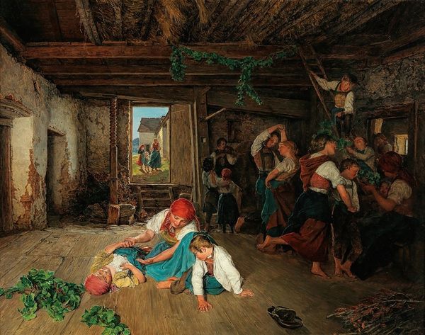 Editor: So, this is Ferdinand Georg Waldmüller’s "Der alte Kasten," from 1860. It’s a genre painting, oil on canvas, and it feels so intimate, like stepping into someone's home. What catches my eye is how meticulously the wooden textures of the wardrobe are painted. What's your interpretation of this piece? Curator: I’m immediately drawn to the materiality of this work. Waldmüller seems fascinated with the object, the ‘old chest,’ and what it signifies in terms of production, consumption, and social standing. Think about the time; 1860. How would the creation and ownership of such a large, ornate piece of furniture impact this family, economically and socially? Editor: That’s interesting. So, you're focusing on the wardrobe as more than just an object? Curator: Precisely. Look at the craftsmanship. This isn't just a functional item, it is labor manifest. Waldmüller painstakingly recreates the grain, the joinery, and even the wear and tear. The choice to portray this everyday scene with such focus on this elaborate wardrobe forces us to confront issues of class and value. Editor: The impasto technique he uses definitely emphasizes the textures. The wardrobe almost feels like it's emerging from the canvas. It stands out as being such high quality compared to other surfaces represented, like the plastered wall and the basic clothing items.. Curator: Exactly! The painting emphasizes not only artistic labor but the various types of labour evident within the scene itself. How would the creation and accumulation of possessions like the chest have shaped daily life? Where does labor end and life begin for those pictured? These objects narrate histories of production and possession far exceeding surface beauty, do you agree? Editor: I never considered it from that perspective. Thank you! Curator: It shows how the artist engaged in that era's discourse. It has been a pleasure to consider its complexities together.