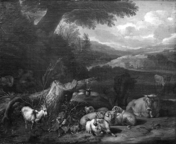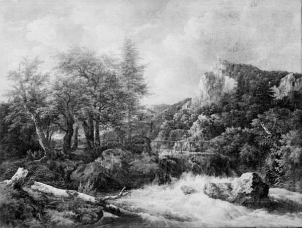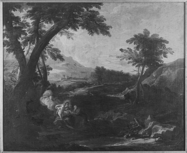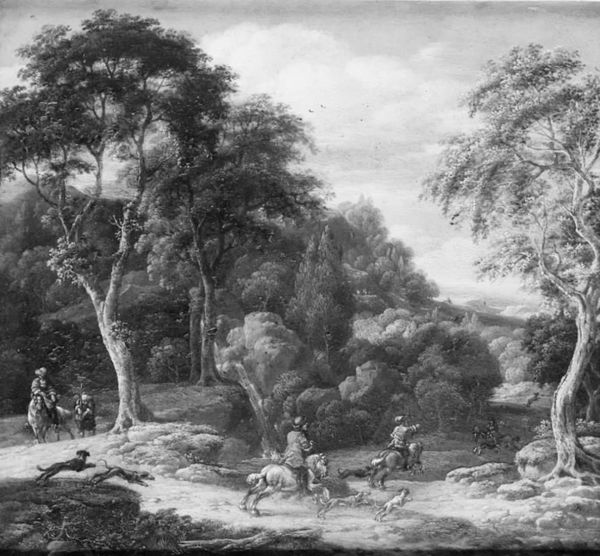 Editor: We're looking at Adriaen Verboom's "The Angler at the Forest Brook," likely painted between 1643 and 1670 using oil on canvas. Even in monochrome, I find the contrast striking. The dark foliage against the lighter sky creates a dramatic effect. What draws your eye in this composition? Curator: The power of this piece, even absent the original color, stems from its strategic composition. Note how Verboom orchestrates the recession into space. The eye is led from the detailed foreground, with its angler sharply defined, back through progressively less distinct layers toward the hazy horizon. Editor: So, the blurring is deliberate? Curator: Precisely. This "atmospheric perspective," is vital. It’s a compositional technique rooted in the manipulation of visual clarity to simulate depth, to draw the eye to and then through the art in order to bring one's eye to specific structural and spatial dynamics, where even if one figure may be at rest, one is ineluctably moving through the composition. Also, observe the dynamic interplay of verticals and horizontals; The verticals of the trees contrasted against the horizontal line of the landscape is essential. It gives this work a measured tension. Editor: Interesting. I hadn't considered how carefully controlled the haziness is. Curator: The very absence of sharp detail in the background underscores this deliberation, and, therefore the intended reading. What appears casual, natural even, is a masterclass in calculated effect. Consider also how the angler provides the anchoring figure to an otherwise indeterminate foreground; an implicit formal construction that ties the painting to the viewer and vice versa. Editor: That makes me appreciate the painting even more. It seems like the composition itself is communicating something. Curator: Exactly. We see a carefully constructed image, where every element contributes to a unified, impactful whole. Editor: I see. Thanks. I will definitely pay more attention to how landscapes orchestrate space from now on!