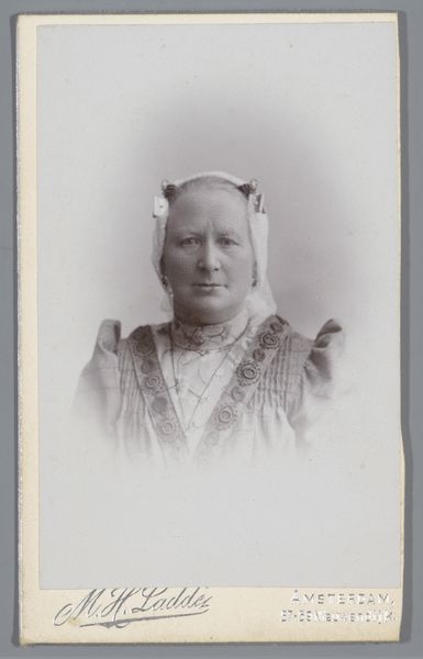 This is a portrait of an unknown woman in traditional clothing, made by De Prins. We see the wet collodion process at work here; a photographic printing process used in the mid-19th century, characterized by its incredible detail, but also its imperfections. Consider that this image was produced by coating a glass plate with light-sensitive chemicals, exposing it in a camera, and then developing it immediately. It was a labor-intensive, time-sensitive operation, requiring specialized knowledge and equipment. This contrasts with the relative ease of modern photography. The tonal range and sharp focus give the woman a strong presence, while the subtle imperfections and hand-applied tinting remind us of the human element in its making. These choices elevate the final product beyond a mere reproduction, blurring the lines between craft and fine art. This invites us to consider photography as a form of material culture, deeply intertwined with industrialization, labor, and the evolving concept of portraiture.